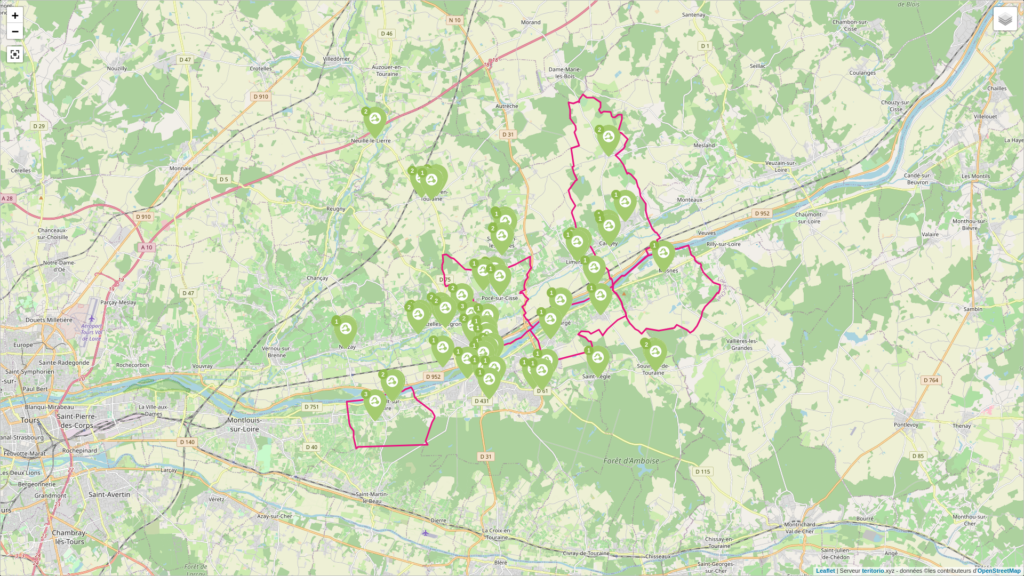 La carte du territoire affiche les contours géographiques en superposition GeoJSON. Elle distingue deux cas : un territoire administratif (département, région) montre les empreintes de tous ses territoires enfants, tandis qu’un territoire technique montre sa propre empreinte — les limites de l’intercommunalité ou de l’agglomération. Les fichiers GeoJSON sont générés en amont via un processus QGIS à partir des données officielles des communes de France, puis servis par l’API.