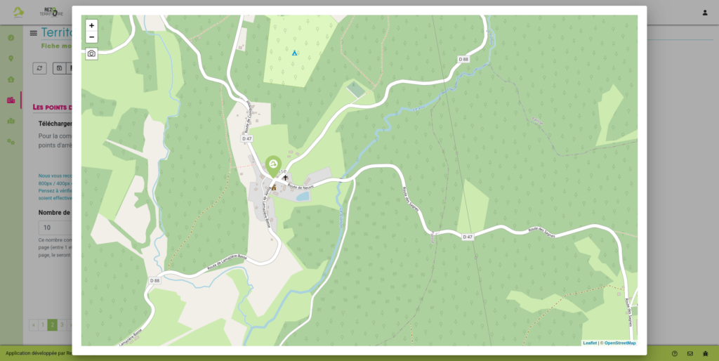 La carte d’une commune combine les contours géographiques, récupérés via l’API geo.api.gouv.fr, avec les marqueurs des points d’arrêt et des points d’inscription. Un code couleur distingue les types de points. Le mode plein écran permet de travailler confortablement sur des communes étendues.