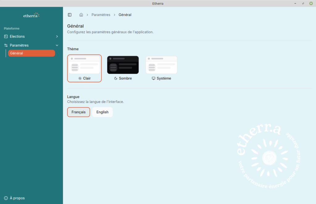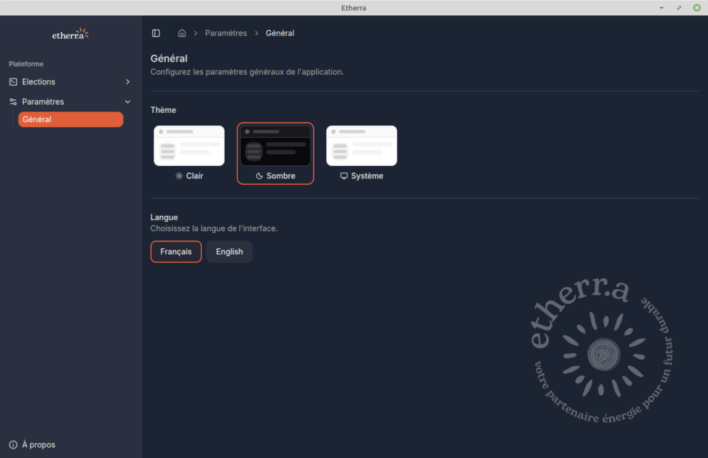 Le thème propose trois modes (Clair, Sombre, Système), chacun illustré par un aperçu miniature de l’application rendu en HTML/CSS. La langue bascule instantanément entre français et anglais, sans rechargement — breadcrumbs, menus et contenus se mettent à jour en temps réel.