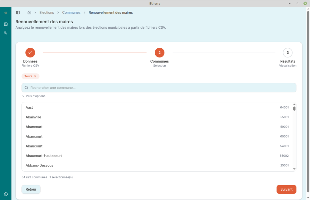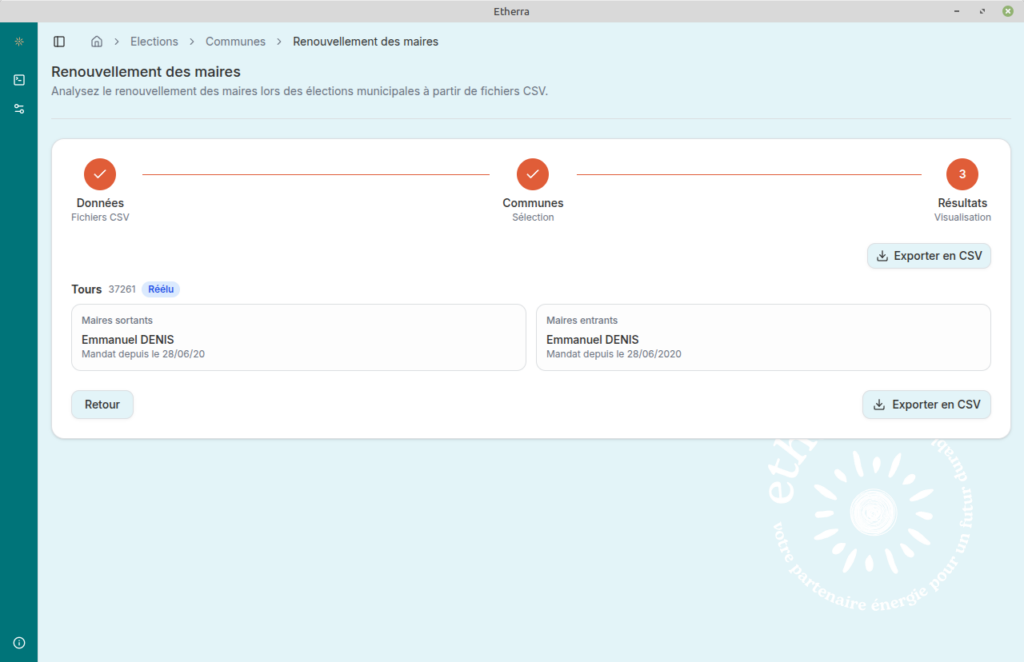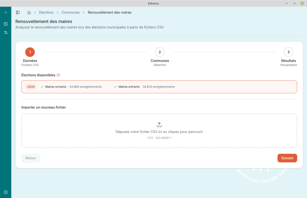 Un stepper en trois étapes guide le processus : import des données, sélection des communes (par recherche textuelle ou code INSEE), puis affichage des résultats — maire sortant, maire entrant, statut réélu ou nouvel élu. Un export CSV permet de récupérer les résultats pour les traiter dans un tableur.